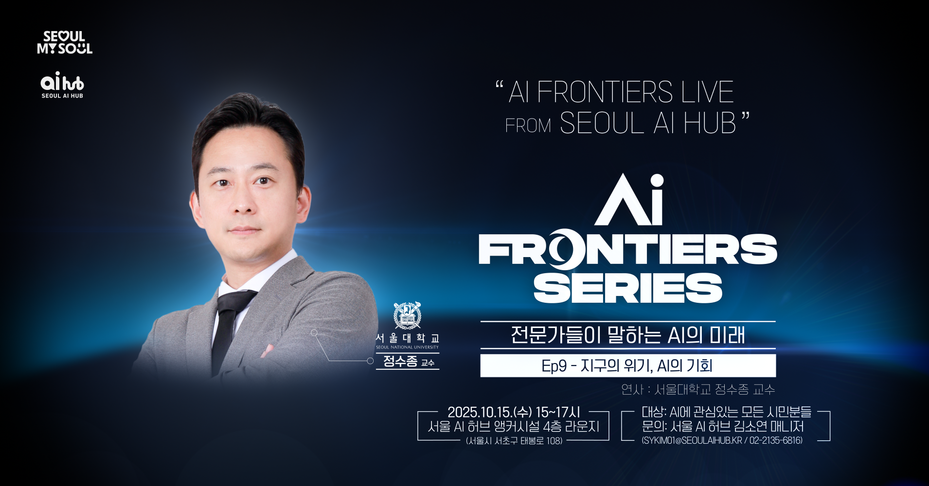정수종 교수님은 서울대학교 환경대학원 교수이자 기후테크센터장으로, 기후 과학과 인공지능을 융합해 지구의 변화를 데이터로 읽어내는 연구를 이끌고 계십니다.