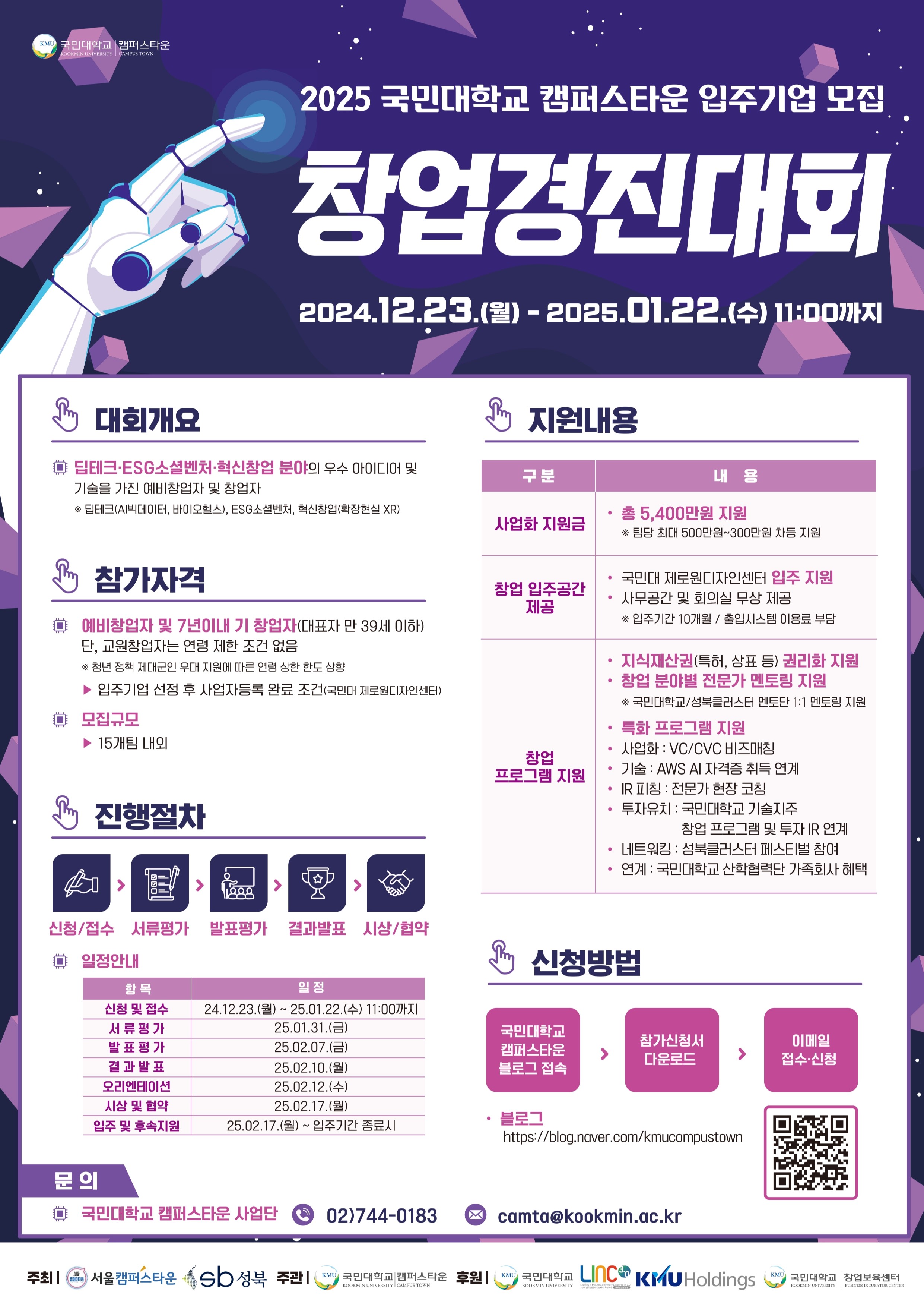 camta@kookmin.ac.kr신청 제출 서류 및 자세한 사항은 하단 국민대학교 캠퍼스타운 블로그 링크 내 공고문 확인 부탁 드립니다.